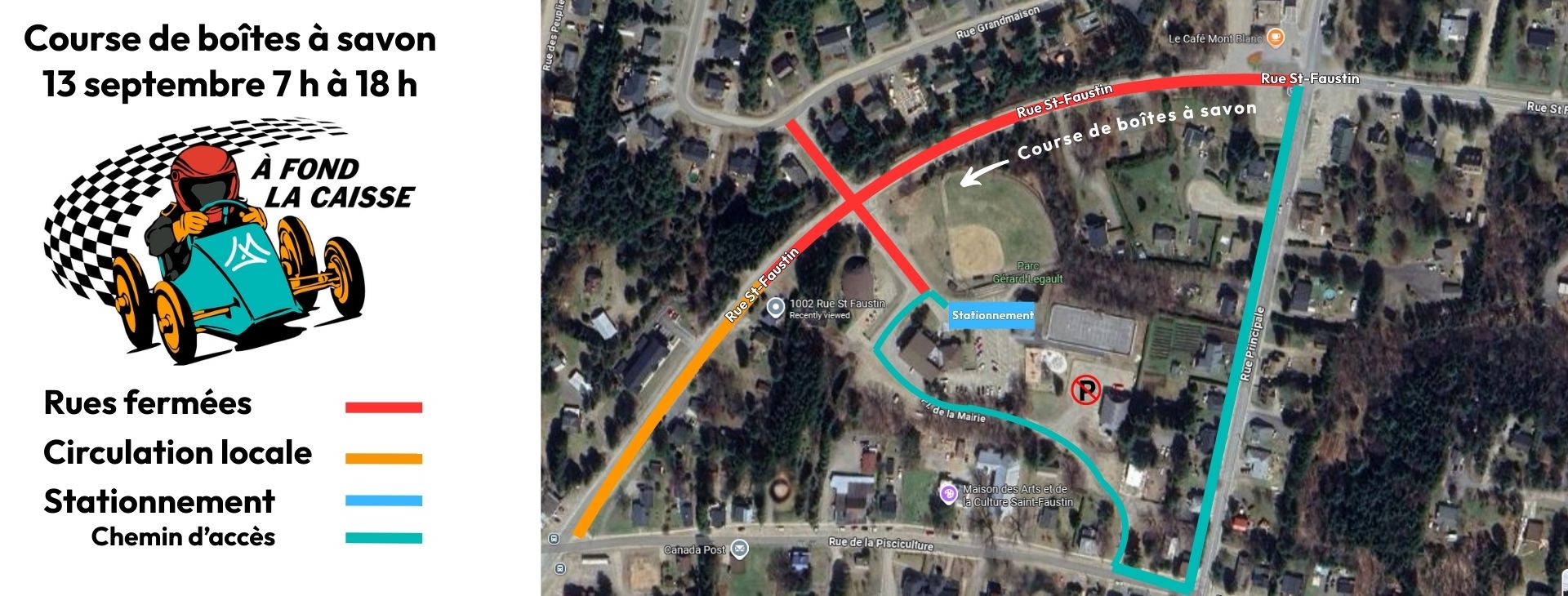 Dans le cadre de l’événement de course de boîte à savon À fond la caisse, certaines rues seront fermées ou limitées à la circulation locale : Samedi le 13 septembre 10 h à 16 h Fermeture de la rue Saint-Faustin à partir du Pétro-Canada jusqu’à l’adresse 1002, rue Saint-Faustin. Fermeture de la sortie de la […]